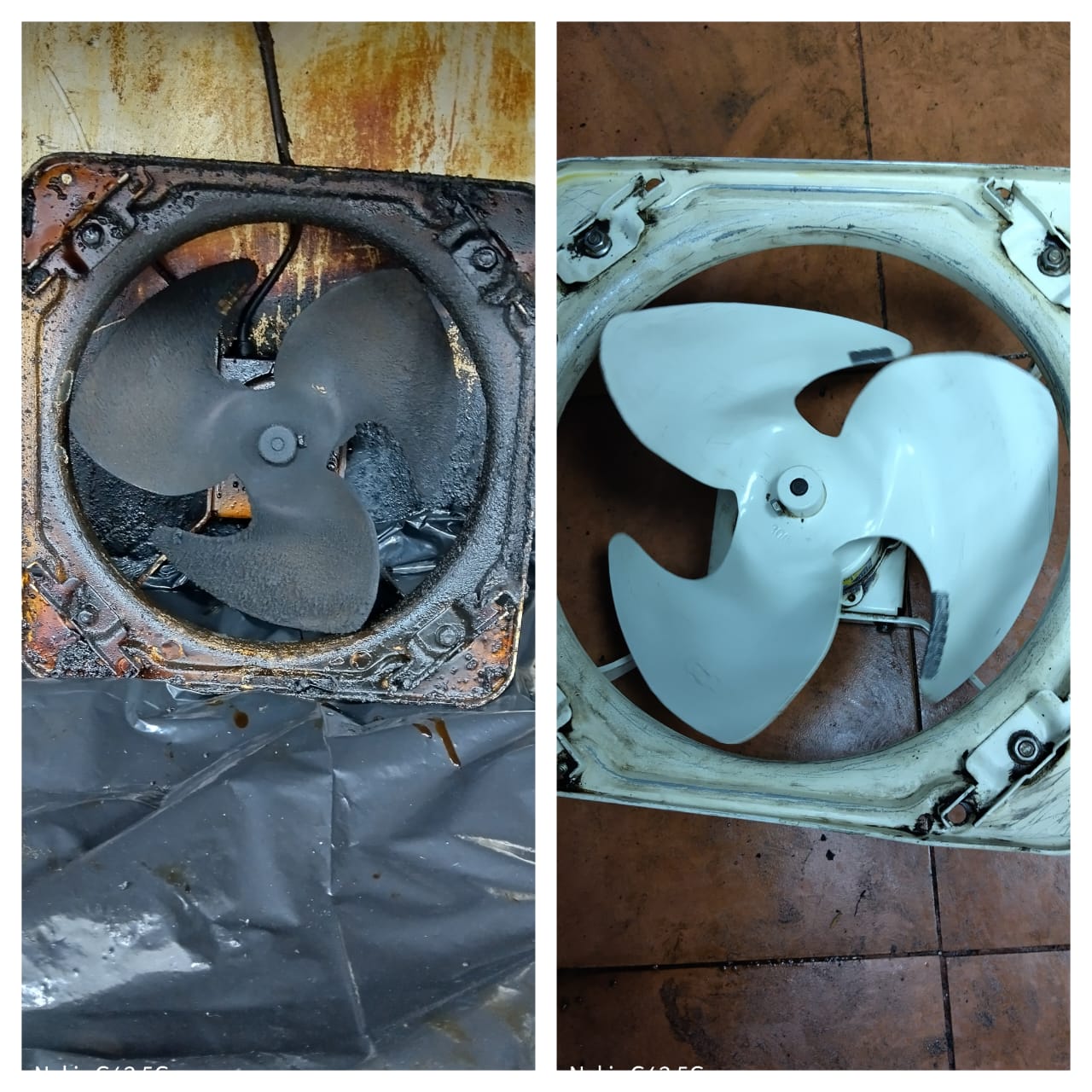 Exhaust fan service — clean the fan housing and blades, check hinges/locks, grease drain/collection cup, and balance as required.