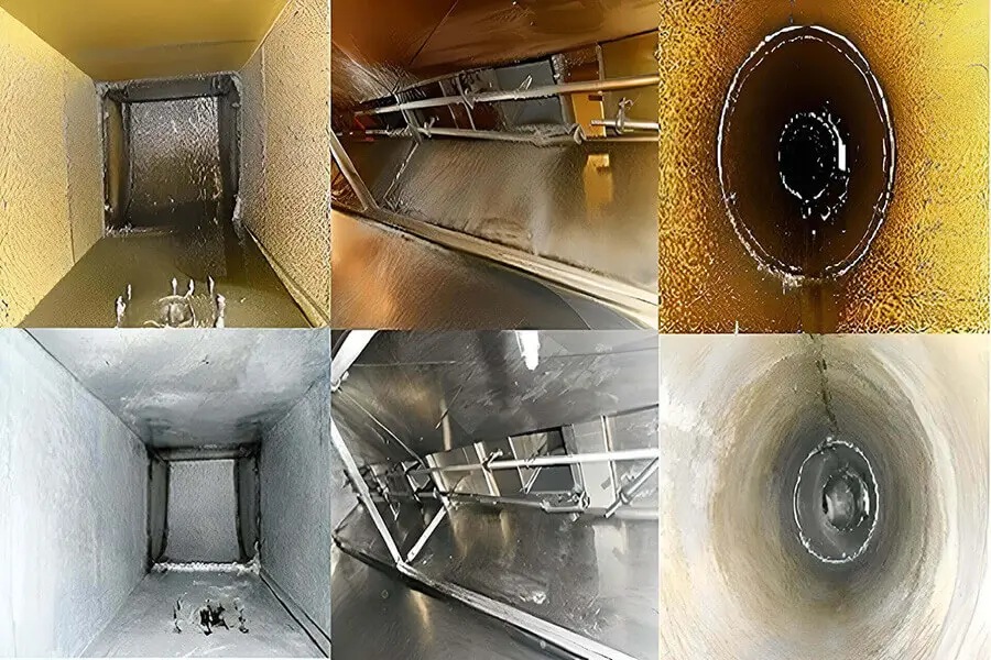 Duct cleaning — open existing access doors (install new ones if required), scrape heavy build-up, apply heated degreaser, then rinse to bare-metal standard.